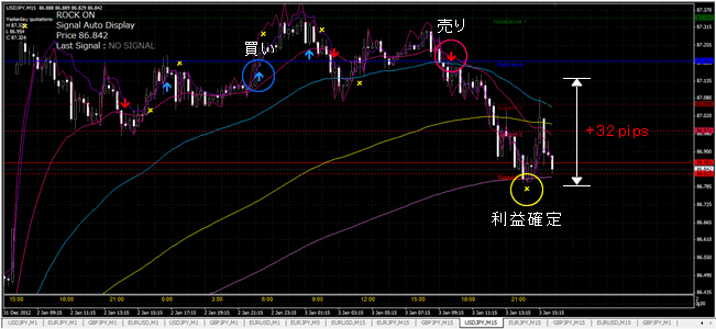 ※青◯が買いシグナル、赤○が売りシグナル、黄◯が利益確定のシグナル。