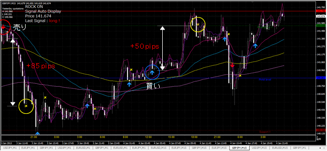 更に下落した140.20付近で今度は買いシグナルが発生し、140.60付近で利益確定シグナル、チャート中心付近で141.00付近の買いシグナルが発生し、141.50付近で利益確定シグナルです。