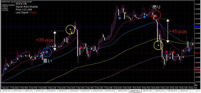 チャートは15分足専用ですが、15分足チャートのみで30分足や1時間足の方向感も把握した上でシグナルを発生してくれる優れものです。